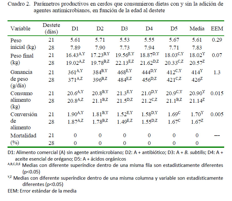 Se evaluó el efecto de la adición de antimicrobianos sobre parámetros zootécnicos y metabólicos en lechones destetados. Se utilizaron 150 lechones, la mitad destetados a los 21 días y la otra mitad a los 28 días. Se tomaron muestras de sangre y control de peso los días 1, 15 y 30 posdestete y se hicieron controles diarios de temperatura rectal y presencia de diarrea. Los cerdos fueron alimentados con una dieta comercial basal y fueron distribuidos en cinco tratamientos: D1 (dieta basal); D2: adición de bacitracina de zinc; D3: adición de Bacillus subtillis; D4; adición de aceite esencial de orégano, D5: adición de ácidos orgánicos. Se utilizó un diseño completamente al azar en un arreglo de parcelas divididas (cinco dietas, tres repeticiones). Los animales que consumieron la dieta D3 (con probiótico) presentaron el mejor índice de conversión alimenticia, mayor ganancia de peso, menor índice de severidad de diarreas (ISD) y mejores parámetros metabólicos (p<0.05), especialmente con relación a los animales de D1 y D2. Los animales destetados a los 21 días presentaron menores índices zootécnicos, mayor ISD y menores valores metabólicos (p<0.05) en comparación a los animales destetados a los 28 días. Se concluye que la adición de B. subtillis y el destete a los 28 días de edad presentan los mejores resultados y puede ser una alternativa nutricional importante para reemplazar los antibióticos promotores de crecimiento en la alimentación en cerdos.