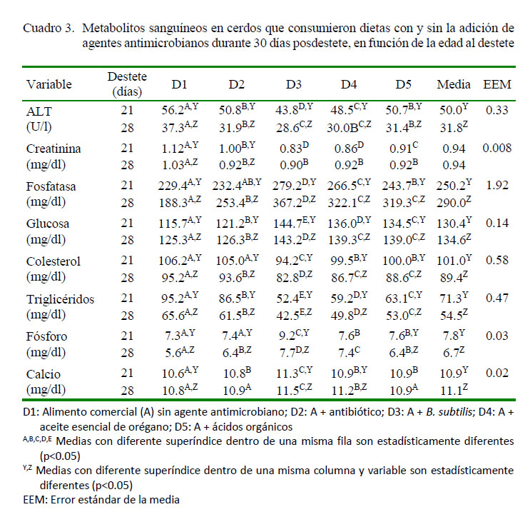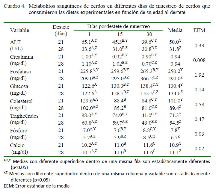 El Cuadro 3 muestra los valores de los metabolitos sanguíneos para las dietas experimentales en función de la edad del destete.