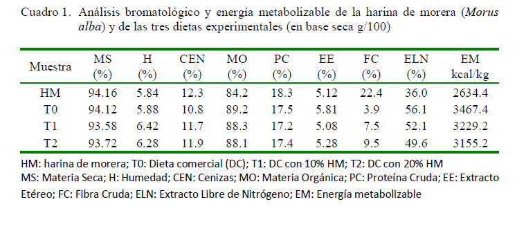 Se utilizó una dieta comercial para pollos de engorde (Pollarina P-1®, Concentrados Valera) con 17.5% de proteína (T0: 100% AB). En las dietas T1 y T2 se sustituyó 10 y 20% de la dieta comercial por harina de morera (HM), respectivamente. Las dietas fueron suministradas ad libitum y en forma de harina.