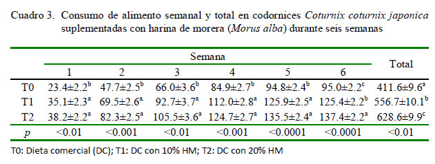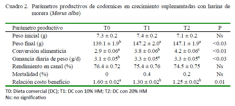La inclusión del 10% de harina de morera fue una alternativa viable para favorecer el crecimiento de la C. coturnix japonica, y para reducir los costos de alimentación.