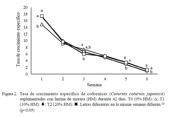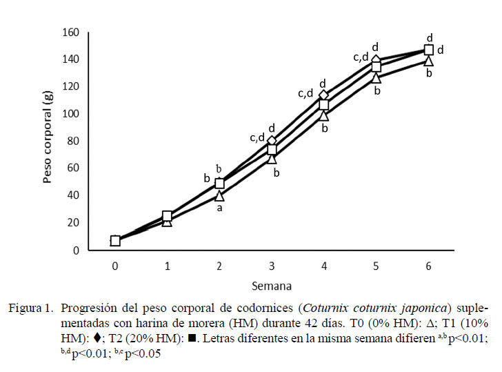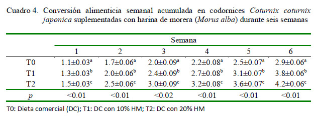 La utilización de harina de morera (Morus alba) en codornices suplementadas durante seis semanas favoreció el desarrollo de las aves, principalmente entre la 2da y 3era semanas del periodo de evaluación.