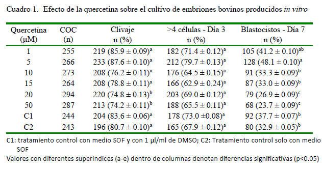 Las tasas de desarrollo y la calidad de los embriones bovinos producidos in vitro son menores que los producidos in vivo, debido al estrés oxidativo al que son sometidos durante su manipulación y las condiciones de cultivo. El objetivo de este estudio fue evaluar la producción, la celularidad y la vitalidad de los blastocistos bovinos producidos in vitro con diferentes concentraciones de quercetina. Un total de 2108 oocitos fueron madurados in vitro en medio 199 con 10% de SFB, 5.0 µg/ml de LH y 0.5 µg/ml de FSH. La fertilización se realizó en medio TALP con 2x106 espermatozoides/ml. Los posibles cigotos fueron cultivados a 38.7 °C con 5% de CO2en medio de cultivo SOF suple-mentado con seis concentraciones de quercetina (1, 5, 10, 15, 20, 50 µM) y como controles se utilizaron el medio SOF sin quercetina y suplementado con DMSO. Se determinaron las tasas de clivaje (día 2) y blastocistos (día 7), así como la celularidad y la viabilidad celular de los blastocistos. Se realizó un análisis de varianza y las medias de los tratamientos se compararon con la prueba de Tukey. Los tratamientos con 1 y 5 µM de quercetina fueron superiores para la tasa de blastocistos (p<0.05). Se observó una reducción en la tasa de clivaje, la tasa de blastocistos y la viabilidad celular para 20 y 50 µM, y se encontró una disminución en la celularidad para 15 µM. La quercetina utilizada a bajas concentraciones durante el cultivo in vitro de embriones bovinos produce un incremento en la tasa de blastocistos, mientras que el uso altas concentraciones de quercetina genera efectos deletéreos en los embriones bovinos.