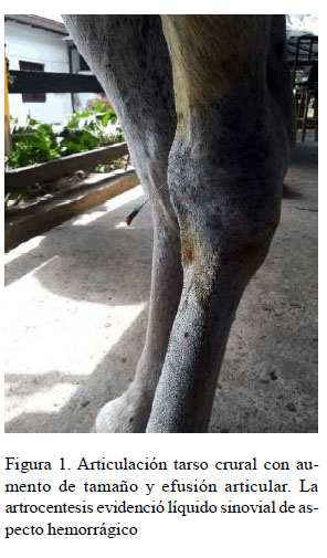 The case of a 15-year-old Colombian equine female, which is presented due to trauma consultation in the medial aspect of the left hind limb is reported. Severe synovial effusion is evidenced with increase in temperature and pain to the touch. An arthrocentesis is performed obtaining hemorrhagic articular fluid. In the radiological evaluation, an increase in the volume and radiopacity of the synovial fluid was observed, and the ultrasound diagnosis revealed an increase in the thickness of the articular capsule, with abundant joint effusion, a heterogeneous-looking fluid and the presence of echogenic bands compatible with fibrin. The therapy consisted in the joint lavage and infiltration with gentamicin, whereas the pain and oedema were treated via systemic.