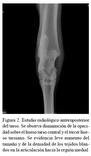 Ante los hallazgos obtenidos en la exploración clínica se hizo un estudio radiológico con vistas latero medial y anteroposterior del tarso izquierdo, encontrando incremento del volumen articular, aumento en el tamaño de la articulación del tarso e incremento en la densidad de los tejidos blandos periarticulares (Figura 2).