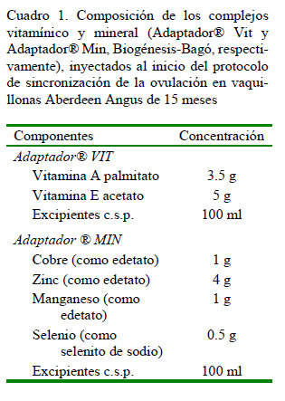 En el día 0 (inicio del estudio) se realizó la palpación transrectal de los ovarios y del útero para determinar el GDR. Los animales fueron divididos en dos grupos. El grupo V+M recibió en forma parenteral 4 ml de un complejo vitamínico (Adaptador® Vit, Biogénesis-Bagó) y 4 ml de un complejo mineral (Adaptador® Min, Biogénesis-Bagó; Cuadro 1) y el grupo Control no recibió el suplemento. Además, se les colocó un dispositivo intravaginal con 0.5 g de progesterona (Cronipres 0.5 g; Biogénesis-Bagó) y se les inyectó 2 mg de benzoato de estradiol (Bioestrogen; Biogénesis-Bagó) por vía i.m. En el día 7 se retiró el dispositivo y se inyectó 0.150 mg de D-cloprostenol (Enzaprost D-C; Biogénesis-Bagó) y 1 mg de cipionato de estradiol (Cipiosyn; Zoetis) por vía i.m.