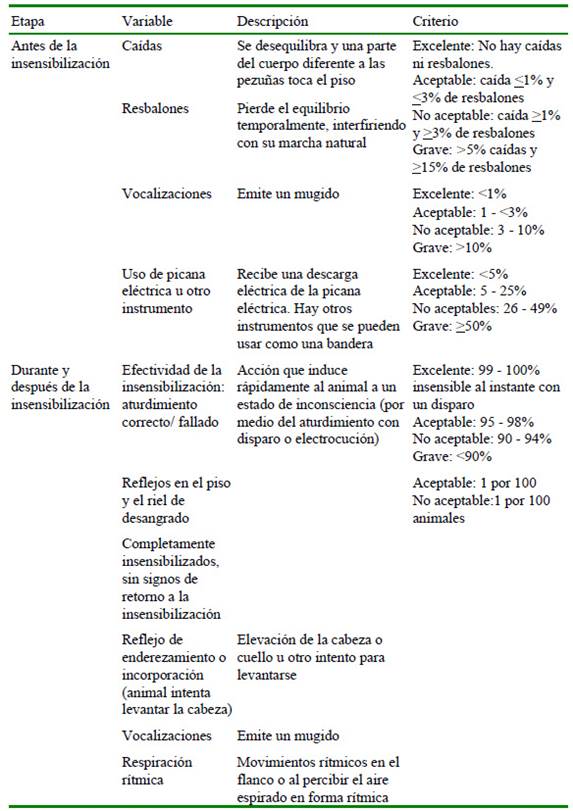 Los parámetros evaluados antes, durante y después de la insensibilización fueron consignados en un formulario, de acuerdo con una metodología modificada y aplicada anteriormente (Grajales, 2010; Grandin, 2010; Romero et al. 2012a,b). Los parámetros en estudio fueron clasificados como excelentes, aceptables, no aceptables y graves, según el porcentaje de ocurrencia propuesto por InstitutoAmericano de la Carne (Grandin, 2010).