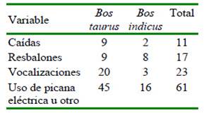 Muñoz et al. (2012) evaluaron los indicadores de bienestar animal en 1025 bovinos de plantas de beneficio, encontrando que 17.2% de los animales vocalizaron durante el arreo al cajón de insensibilización. En este estudio, las vocalizaciones se presentaron en el 23% de los animales, (Cuadro 2), lo cual se considera un problema grave, al igual que en el estudio anteriormente mencionado. Por otro lado, para Grajales (2010), las vocalizaciones en el ganado se presentan por acciones que les generan dolor y estrés, tales como el uso de picana eléctrica u otro objeto, además de las caídas y resbalones. Esto podría indicar una inadecuada relación entre el operario y el animal por deficiencias en el manejo, situación que genera miedo y estrés en los animales, favoreciendo los resbalones y caídas y, por lo tanto, aumentando las lesiones y hematomas, así como accidentes de trabajo (Romero et al., 2012b).