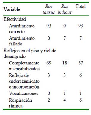 Grandin (2010) afirma que el punto de entrada de pistolas de perno cautivo penetrante varía entre el ganado Bos taurus y el Bos indicus. Con respecto a esto, se observó una gran diferencia en el aturdimiento entre las dos especies bovinas, dado que el ganado cebú no era aturdido correctamente, Para aumentar los porcentajes de insensibilización se tendría que capacitar y mejorar las habilidades de la persona encargada del aturdimiento de los animales (FAO, 2007).