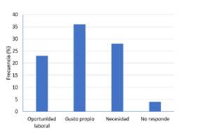 El 36% de los operarios tomaron la decisión de trabajar en la planta por gusto propio, mientras que para el 32% fue una oportunidad laboral y para el 28% por necesidad económica (Figura 2). Para el caso de los conductores de camiones de transporte de ganado, Pérez et al. (2017) reportó que el 83% de 20 conductores lo hacían por falta de empleo y necesidad económica y solo el 17% porque les motiva y es de su agrado.