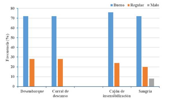 El 93% de los animales fueron aturdidos correctamente mediante un solo disparo a nivel frontal de la cabeza, mientras que el 7% tuvieron un aturdimiento fallido, requiriendo dos disparos. Sin embargo, el 6% de los animales correctamente aturdidos presentó reflejos de incorporación, vocalizaciones y respiración rítmica, debido a que el tiempo entre la insensibilización y la sangría superó los 60 segundos. Este resultado es considerado como No Aceptable bajo los estándares del Instituto Americano de la Carne. En este sentido, Gamón (2018), trabajando en mataderos en Bolivia, encontró intervalos entre el aturdimiento con un solo disparo superiores a 60 segundos, existiendo casos de hasta seis disparos y cinco minutos para la sangría, lo que causaba el retorno de la sensibilización de los animales. Patiño et al. (2019) han señalado que cuando los porcentajes del primer disparo (noqueo o insensibilización) se encuentran por debajo de lo recomendados (9598%), se considera como una debilidad a corregir.