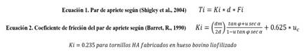 Figura 3 Ecuación 1. Ecuación que permite estimar el par de fuerzas requerido para apretar el tornillo ortopédico. Ti = Par de apriete indicado para el implante, Ki = Coeficiente de par de apriete dependiente de la forma del implante y el tipo de hueso; d = Diámetro nominal del implante, F1 = Fuerza indicada para la inserción del implante. Ecuación 2. Coeficiente de fricción del tornillo entre el hueso del animal y la rosca del tornillo HA fabricado en hueso liofilizado. Dm es el diámetro medio del tornillo, ö, á son los ángulos de la rosca del tornillo, ì es el coeficiente de fricción estático entre dos huesos.