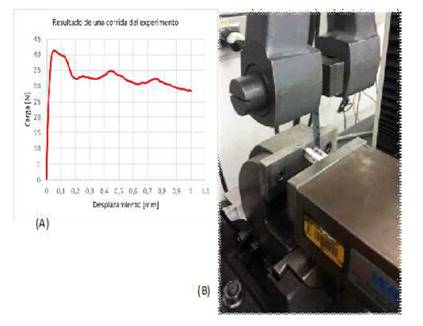 A partir de cada observación realizada del experimento se obtiene como resultado una gráfica, fuerza vs. desplazamiento (Figura 4A), tomándose la fuerza más alta de extracción como la mínima fuerza requerida para extraer la platina. Este valor de fuerza en Newtons se reporta en el Cuadro 1 para cada observación del experimento. El experimento se realizó con ayuda de la máquina de ensayos de tensión Instron 5586 (Massachusetts, USA), la cual extrae la platina metálica a una velocidad constante de 0.5 mm/min. En esta máquina se adaptó una prensa manual para sujetar las probetas del experimento. En la Figura 4B se muestra la probeta montada en la máquina de ensayos justo antes de extraer la platina.