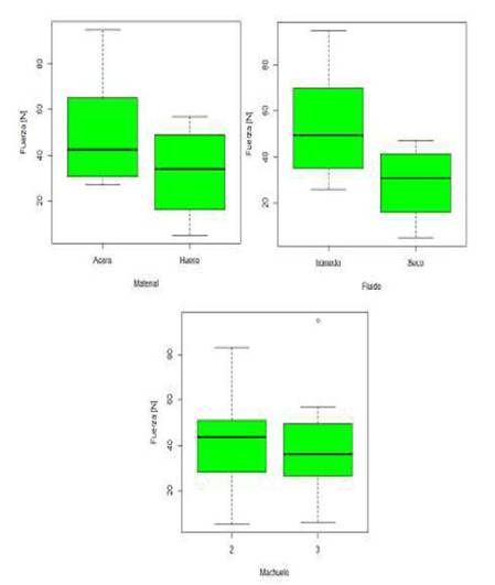 Con base en los datos del Cuadro 1, mediane diagramas de cajas que se presentan en la Figura 5a-c, se analiza el comportamiento de la fuerza de extracción para cada factor del experimento, donde se observan diferencias significativas entre los niveles del factor fluido de hidratación y el tipo de material (Figura 5; p=0.027). Es decir, el humectar el tornillo en solución salina provoca una variación en la fuerza de extracción de la platina. Por otro lado, los factores tipo de material del tornillo y número de pasadas del machuelo no fueron estadísticamente significativos; es decir, estos dos factores no presentan una variación sobre cómo se inserta el tornillo ortopédico HA.
