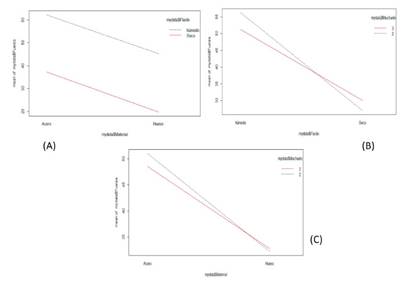 Figura 6 Diagrama de interacciones entre los factores del estudio, A) Entre el factor material y el factor fluido; B) Entre el factor fluido y el factor machuelo; C) Entre el factor material y el factor machuelo.