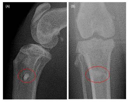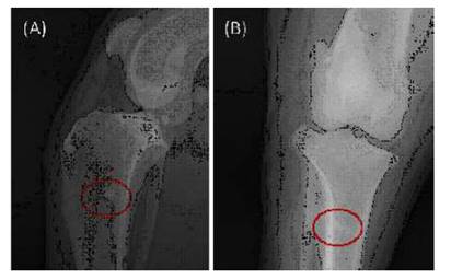 Figura 7 Tornillo de hueso bovino liofilizado insertado en paciente canino sometido a cirugía de reparación extraarticular de ruptura de ligamento cruzado anterior. Radiografía tomada inmediatamente después de la cirugía, A) Vista frontal, B) Vista lateral