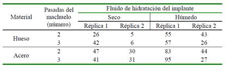 El empleo de tornillos de acero en ambientes húmedos obtiene valores de fuerza mayores (83 y 95 N), mientras que al utilizar tornillo de hueso en ambientes secos se obtienen los menores valores de fuerza (5 y 6 N). A partir de estos datos se obtiene el análisis cualitativo y cuantitativo del experimento, el cual, con base en el comportamiento de los factores y sus interacciones, describe un procedimiento para la implantación de tornillos HA fabricados en hueso bovino liofilizado.