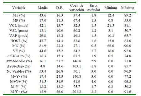 Los resultados de la evaluación de la calidad espermática por métodos convencionales, computarizados y citometría de flujo se presentan en el Cuadro 1. Se evaluaron un mínimo de cinco pajillas de semen congelado-descongelado por eyaculado, con la finalidad de reducir la variabilidad por efecto de la repetición. Se observó entre media y alta variabilidad en la mayoría de los parámetros de calidad seminal, siendo mayor en algunas poblaciones de espermatozoides según el ΔψM y la estabilidad de membrana.