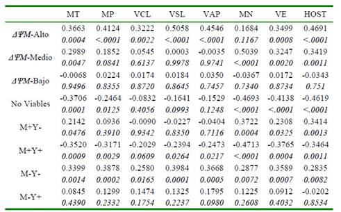 Los resultados se presentan como coeficiente de correlación (arriba), valor p (abajo). MT: movilidad total. MP: movilidad progresiva. VCL: velocidad curvilínea. VSL: velocidad lineal. VAP: velocidad media. MN: morfología normal. VE: vitalidad espermática. HOST: integridad funcional de membrana. ΔΨM-Alto: espermatozoides con potencial de membrana mitocondrial alto. ΔΨM-Medio: espermatozoides con potencial de membrana mitocondrial medio. ΔΨM-Bajo: espermatozoides con potencial de membrana mitocondrial bajo. M+Y-: espermatozoides criocapacitados no-apoptóticos. M+Y+: espermatozoides criocapacitados apoptóticos. M-Y-: espermatozoides no-criocapacitados no-apoptóticos. M-Y+: espermatozoides no-criocapacitados apoptóticos