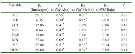 MT: movilidad total. MP: movilidad progresiva. VCL: velocidad curvilínea. VSL: velocidad lineal. VAP: velocidad media. MN: morfología normal. VE: vitalidad espermática. HOST: integridad funcional de membrana. ΔΨM-Alto: espermatozoides con potencial de membrana mitocondrial alto. ΔΨM-Medio: espermatozoides con potencial de membrana mitocondrial medio. ΔΨM-Bajo: espermatozoides con potencial de membrana mitocondrial bajo. r2: coeficiente de determinación del modelo de regresión