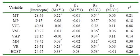 A pesar de esto, los coeficientes de regresión estimados para dicha población no fueron significativos. Por otro lado, se hallaron coeficientes de regresión positivos entre la población de espermatozoides criocapacitados no-apoptóticos (M+Y-) con MT, MN, VE y HOST (p<0.05), mostrando que la reducción en la presentación del proceso de apoptosis de los espermatozoides criopreservados influye positivamente en la calidad posdescongelación de las muestras de semen.