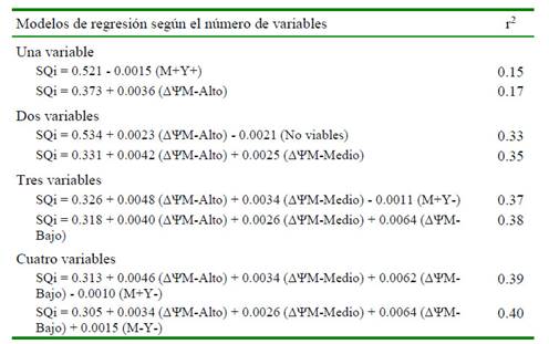 El Cuadro 5 presenta los mejores modelos de regresión para el SQi, según el número de variables incluidas a partir de la evaluación por citometría de flujo de la estabilidad de membrana y la actividad mitocondrial. Para el SQi del semen criopreservado se encontró un valor promedio de 0.43 ± 0.12 (media ± DE), cuyos resultados estuvieron en un rango entre 0.21 y 0.80. Los máximos coeficientes de determinación (r2), se alcanzaron en los modelos de cuatro variables, donde se incluyeron todas las poblaciones de espermatozoides según su potencial de membrana mitocondrial y alguna de las poblaciones con espermatozoides no-apoptóticos del análisis de estabilidad de membrana. Lo anterior, muestra como la actividad mitocondrial y el estado de apoptosis aportan de forma importante a la calidad seminal, y deja abierta la posibilidad de incluir otros parámetros evaluados por citometría de flujo en modelos de regresión, con la finalidad de incrementar la predictibilidad de la fertilidad potencial del semen bovino criopreservado.