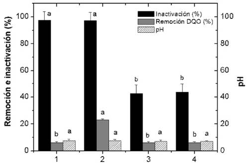 En la Figura 1 se presentan los resultados para el porcentaje de inactivación de Salmonella spp, remoción de DQO y pH final en función de los cuatro tratamientos. Se observaron diferencias significativas entre tratamientos (p<0.0001) con respecto al