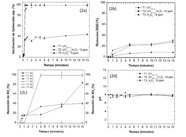 La remoción de DQO no fue tan elevada (30±2% y 27±3% para T1 y T2) como la inactivación de Salmonella spp (99.9%), sugiriendo que para la oxidación de la materia orgánica y mineralización hasta CO2 se requiere mayor tiempo de proceso. Por otro lado, se debe considerar que al realizarse la inactivación de Salmonella spp, se liberan componentes celulares que a su vez se convierten en materia orgánica potencialmente oxidable que podría ser eliminada si se incrementa el tiempo de proceso. Hernández et al. (2015) observaron que independiente de la composición química del agua, los tiempos para remover la DQO son más prolongados que los utilizados para inactivar bacterias, ya que fueron necesarias 14 horas de tratamiento para eliminar el carbono orgánico total y color y solamente 50 minutos para inactivar bacterias, cuando se utiliza solamente luz ultravioleta.