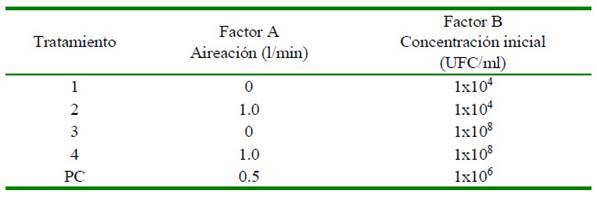 Para evaluar el efecto de la aireación y la concentración inicial del microorganismo que favorecen la inactivación por fotólisis, se realizó un diseño factorial de 2x2 con tres puntos centrales (PC) (Cuadro 1). Para tener mayor control del experimento, dado que en el agua de las granjas no se detectó Salmonella spp, el agua se esterilizó y se inoculó con una suspensión de Salmonella spp, que tenía una concentración de 1x108 UFC/ ml.Al finalizar el proceso, se realizó la dosificación del agua para tener las concentraciones a evaluar en el factor B y los puntos centrales. De esta forma se pudo evaluar la inactivación y el efecto de la carga de la materia orgánica presente en el agua y expresada como DQO.