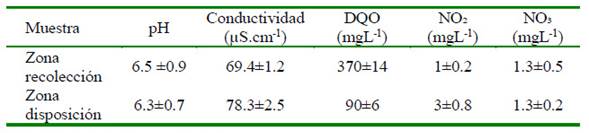 El agua reinoculada con Salmonella spp tuvo un pH de 7.9, conductividad de 68.8 µS.cm-1, DQO 250 mg/l, nitritos 1.0 m/gl, nitratos 0.6 mg/l y una concentración inicial de Salmonella spp de 24x105 UFC/ml.