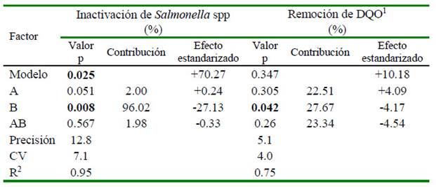 El modelo de regresión porcentaje de inactivación de Salmonella spp fue significativo (R2 = 0.95; p=0.025). El factor que tuvo el porcentaje de contribución más alto fue la concentración inicial de Salmonella spp (B) con 96.02% y un valor de p=0.008. El factor aireación (A) y la interacción de AB no fueron significativos (Cuadro 3).
