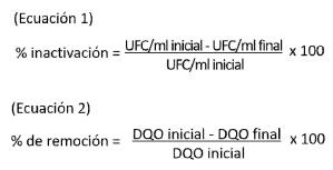 donde, en la Ecuación 1, UFC/ml iniciales corresponden a los recuentos iniciales y UFC/ ml finales son los recuentos a los 10 minutos de exposición a la luz ultravioleta, y en la Ecuación 2, DQO inicial es la concentración en mg/l y DQO final es la concentración en mg/l final a los 10 minutos de exposición a la luz ultravioleta.