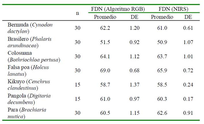 Cuadro 1 Porcentajes de fibra detergente neutra (FDN) medidos por el algoritmo de análisis de imágenes RGB y por espectroscopia del infrarrojo cercano (NIRS)