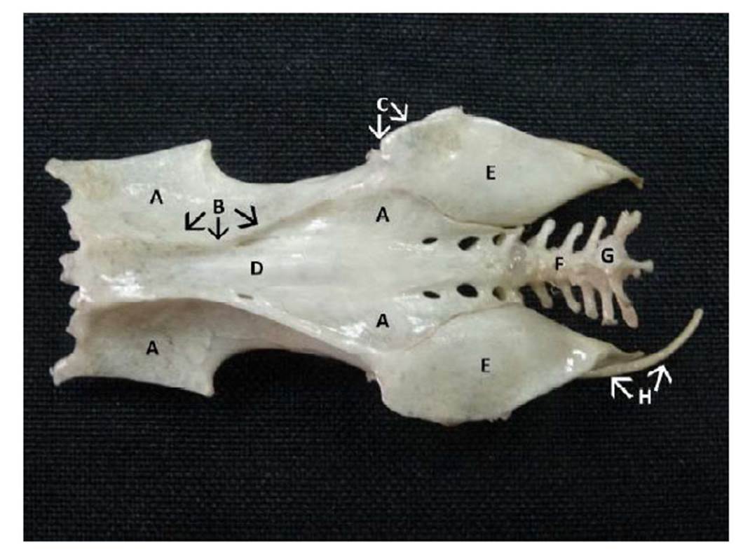 Figura 1 Vista dorsal de la región pélvica de un espécimen de lechuza común. A. ilion; B. cresta iliaca craneal; C. cresta iliaca caudal; D. sinsacro; E. isquion; F. vértebras caudales; G. pigóstilo; H. pubis
