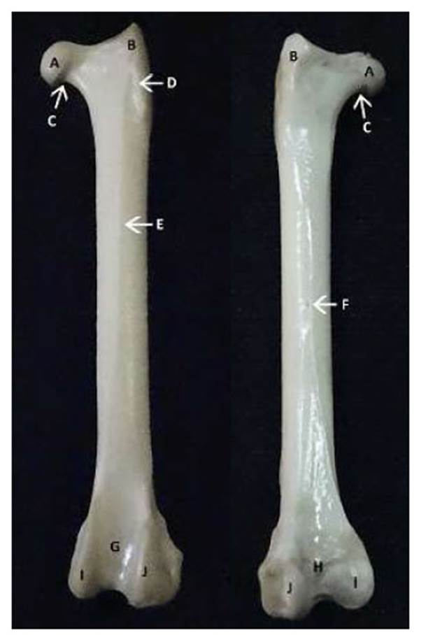 Figura 3 Vista craneal (izquierda) y caudal (derecha) de fémur izquierdo de un espécimen de lechuza común. A. cabeza femoral; B. trocánter; C. cuello; D. cresta trocantérica; E. diáfisis; F. agujero nutricio; tróclea; H. fosa intercondilar; I. cóndilo medial; J. cóndilo lateral