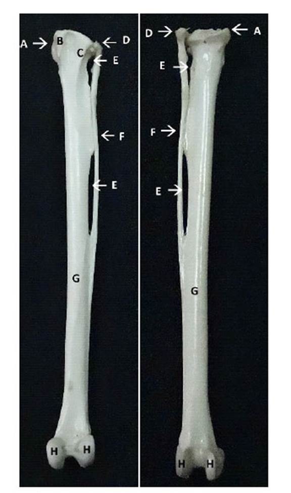 Figura 4 Vista caudal (izquierda) y craneal (derecho) de tibiotarso izquierdo de un espécimen de lechuza común. A. cóndilo medial; B. cresta cnemial medial; C. cresta cnemial lateral; D. epífisis proximal de la fíbula; E. espacios interóseos proximal y distal; F. diáfisis de la fíbula; G. diáfisis del tibiotarso; H. cóndilos