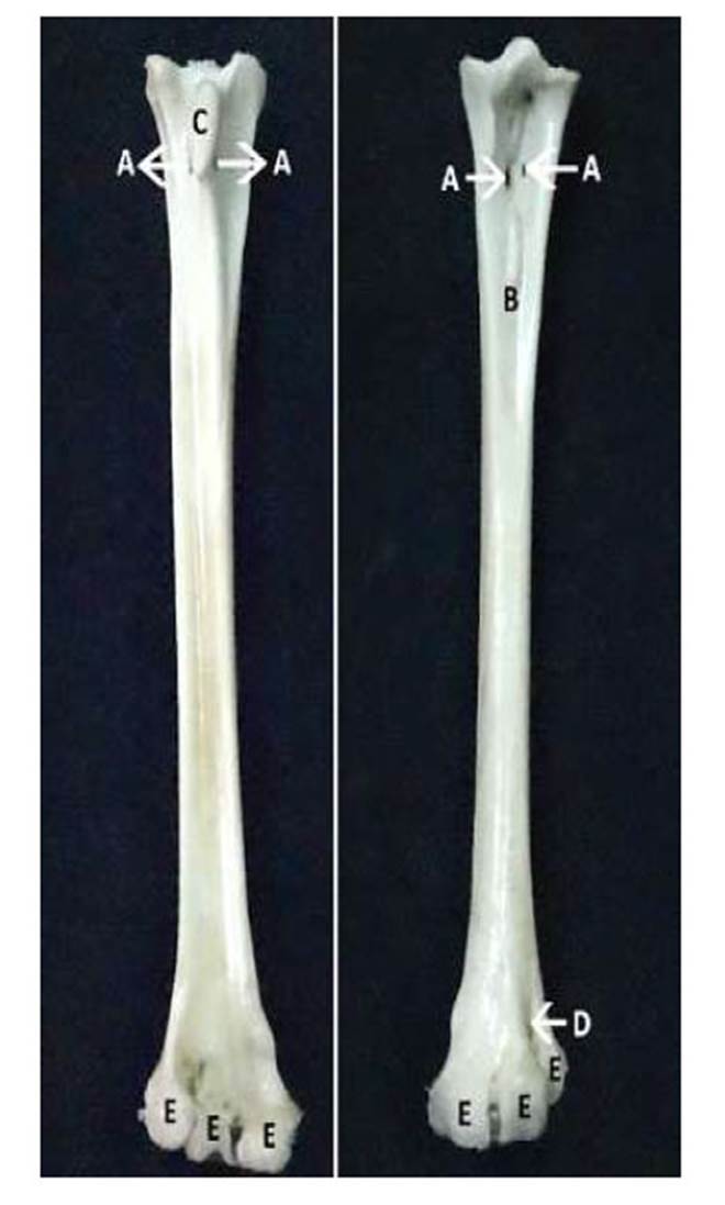 Figura 5 Vista caudal (izquierdo) y craneal (derecho) de tarsometatarso izquierdo de un espécimen de lechuza común. A. agujeros proximales; B. surco metatarsiano dorsal; C. hipotarso, D. agujero distal; E. trócleas para la articulación de los dedos