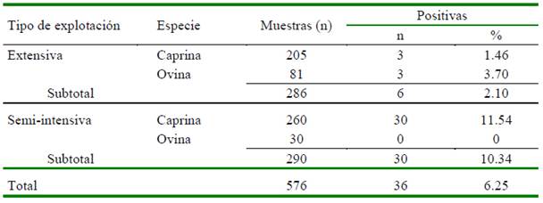 Treinta de las 260 muestras de suero de caprinos criados en sistemas semi-intensivos resultaron positivos (11.54%) (Cuadro 1). Por su parte, ninguna de las 30 muestras de ovinos colectadas en las mismas explotaciones caprinas resultó seropositiva. Estos resultados indican un nivel de positividad bajo en comparación con reportes de otros países (Adams et al., 1984), pero es relativamente mayor si se compara con el 2.10% encontrado en el presente estudio en la ganadería extensiva, lo cual concuerda con Contreras y Sánchez (2003), quienes indican un mayor riesgo de presentarse la enfermedad en las explotaciones caprinas de producción de leche con ordeño.