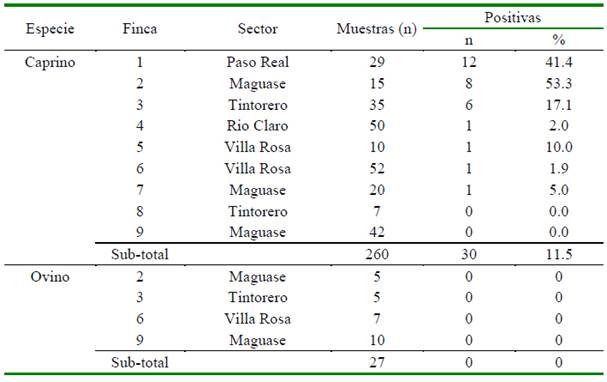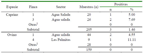 En las ganaderías de caprinos y ovinos de ganadería extensiva en el municipio Torres se determinó una seroprevalencia de 2.1% (6/286. Para el caso de los caprinos, la seropositividad fue de 1.46% (3/205) en tanto que para los ovinos fue de 3.70% (3/81) (Cuadro 1).