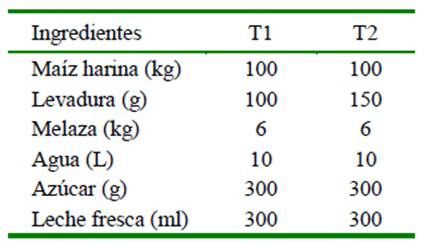 Se trabajó con dos niveles de inclusión de S. cerevisiae cepa comercial Levapan, utilizada en la industria panificadora, donde los tratamientos experimentales fueron T1 (100 g) y T2 (150 g) en la formulación del suplemento, el cual tenía como base harina de maíz amarillo (híbrido FNC 115) y melaza como edulcorante (Cuadro 1). Se utilizó le- che y azúcar como activadores de la levadura. El agua se precalentó a 38 °C donde se diluyó la melaza. Cuando la levadura empezó a crecer se mezclaron todos los materiales hasta obtener una consistencia homogénea. La mezcla se almacenó por 48 h en un lugar fresco y seco, posteriormente se empacó en sacos de nylon y se llevó a la finca. La cantidad de suplemento suministrada fue de 2 kg/animal/día y se asumió un consumo de materia seca del 3% del peso vivo animal (13.5 kg/día de MS).