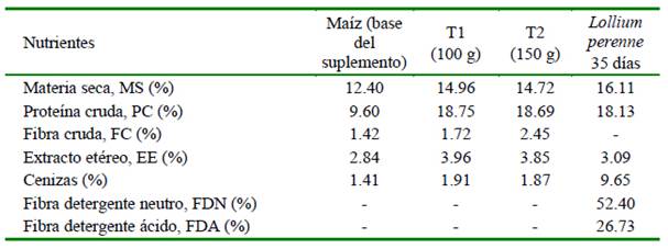 La composición química del suplemento experimental y del forraje base de la alimentación (L. perenne de 35 días) se presenta en el Cuadro 2. No se encontraron diferencias significativas en la composición nutricional del suplemento a base de maíz con los dos niveles de inclusión de S. cerevisiae; sin embargo, el incremento en el contenido de PC fue evidente al incluir al maíz amarillo comercial.
