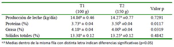 No se encontraron diferencias estadísticas para la producción de leche vaca/día (14.86 vs 14.27 kg; Cuadro 3). Sin embargo, para las fracciones de proteína y grasa hubo diferencias significativas (p<0.05) evidencian- do ventajas para el tratamiento 1 (100 g de S. cerevisiae). La producción de leche antes del experimento fue de 13.39 kg/vaca/día demostrando que la suplementación estratégica con S. cerevisiae tuvo un incremento de 1.47 kg y 0.88 kg para los tratamientos 1 y 2 respectivamente.