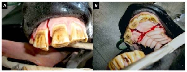 Figura 1 Caballo criollo colombiano, macho de 7 años con fractura del hueso incisivo. A. Vista frontal. B. Vista interna del paladar