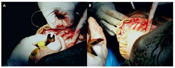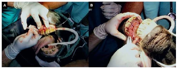 Figura 2 Caballo criollo colombiano, macho de 7 años con fractura del hueso incisivo. A. Paso del cable (alambre interdental) por intermedio de las pinzas. B. Paso del cable (alambre interdental) entre los medios