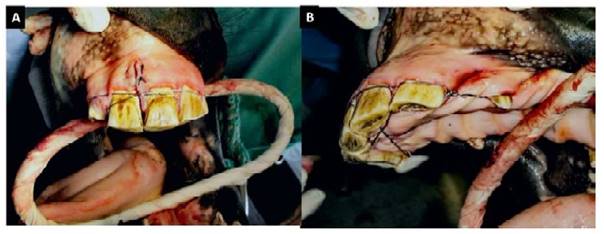 Figura 3 Caballo criollo colombiano, macho de 7 años con fractura del hueso incisivo. A. Fijación del cableado al canino. B. Anclaje del cableado interdental al canino