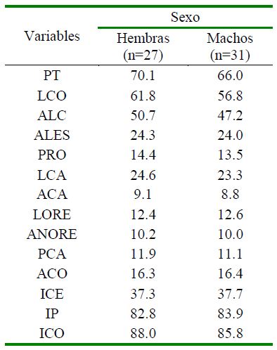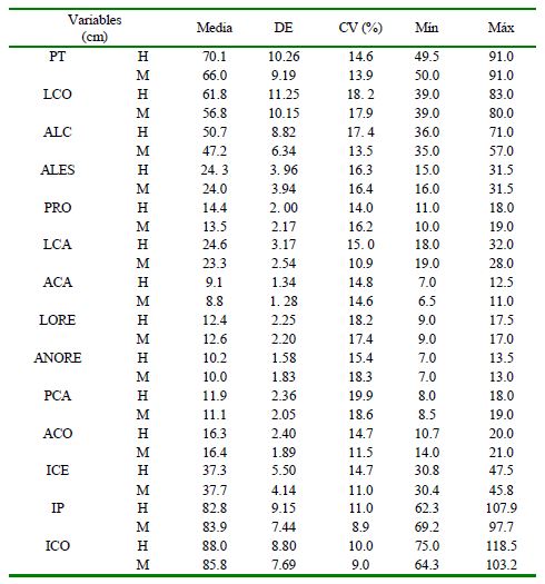 Se realizó un análisis de estadística descriptiva por sexo que incluían las medidas de tendencia central (media); y la desviación estándar (DE), el coeficiente de variación (CV), máximo (Máx.) y mínimo (Mín.) como medidas de dispersión. De igual forma, para evaluar la relación entre variables morfométricas, se estimaron correlaciones de Spearman.