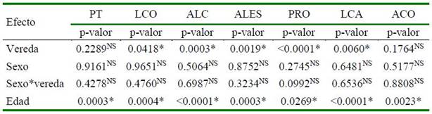 Las variables de medidas corporales para cada efecto ambiental se presentan en el Cuadro 2. La vereda fue el único efecto que influyó sobre el comportamiento medio de las variables LCO, ALC, ALES, PRO y LCA (p<0.05). De igual forma, la covariable «edad» influyó (p<0.05) para PT, LCO, ALC, ALES, PRO, LCA y ACO, efecto esperado dado el rango de edades evaluadas.