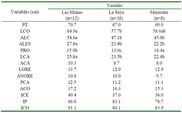 Se observa una amplia variabilidad de algunas medidas corporales e índices en las tres veredas estudiadas (Cuadro 3). Los va- lores medios para la mayoría de las variables estudiadas fueron mayores en la vereda Las Monas (excepción PRO, que fue mayor en Merecure), seguida de La Saya y Merecure. Aunque todas las medidas tienen importancia morfométrica, se resalta las diferencias (p<0.05) en LCO, ALC, ALES, PRO y LCA.