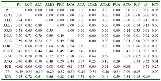 El IP presentó correlación negativa con todas las variables, el ICO se correlacionó negativamente con el IP y el ICE presentó correlación negativa con PT, LCA y ACO, lo que puede estar asociado con el aumento o disminución de las variables que los conforman.