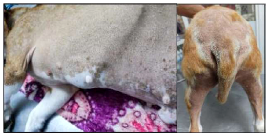 En la evaluación clínica, mediante tacto rectal, se encontró la próstata aumentada de tamaño y asimétrica, dolor al realizar el tacto rectal, ausencia de testículos en la bolsa escrotal y región inguinal, alopecia en región ventral del cuello, tronco, periné, pecho y cola, y presentaba ginecomastia (Figura 1).