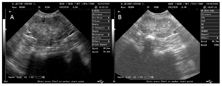 Se tomaron muestras de sangre para hemograma, perfil hepático (alanina aminotransferasa [ALT], fosfatasa alcalina sérica, albúmina, ácidos biliares), y perfil renal (creatinina, nitrógeno ureico en sangre [BUN], calcio, fósforo, ácido úrico).Además, se obtuvo una muestra de orina por cistocentesis para uroanálisis. En el hemograma se encontró trombocitopenia y neutrofilia con desviación a la izquierday y en el uronanálisis se identificó la presencia de espermatozoides, leucocituria (3+) proteinuria (2+) y sangre (2+). Además, se realizó ecografía transabdominal donde se identificaron los testículos retenidos, la próstata aumentada de tamaño, con un parénquima heteroecogénico y microquistes (Figura 2).